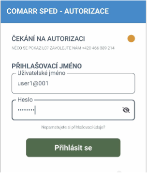Na první obrazovce po instalaci a spuštění aplikace zadáte své přístupové údaje, které získáte po objednání přístupu (https://spedice.comarr.cz/objednavka) a zaslání smluv. Své přístupové údaje můžete zjistit i později přihlášením do správy uživatele (https://spravasped.comarr.cz).