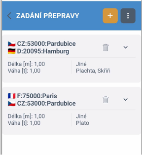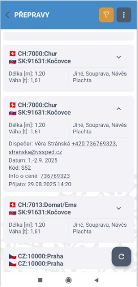 V okně nabídek vidíte základní údaje o nabídce. Jaké položky z nabídky se zobrazují, lze definovat v nastavení (3 tečky v pravém horním rohu). Kliknutím na šipku vedle místa Odkud a Kam se zobrazí další informace o nabídce. Kliknutím kamkoliv jinam na nabídce se zobrazí kompletní nabídka i se zadavatelem. Kliknutím na telefonní číslo u zadavatele můžete rovnou vytáčet.